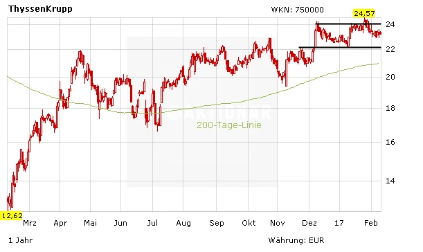 Die Finanzierung bleibt ein Problem. Eine Fusion der europäischen Stahlaktivitäten mit Tata Steel wäre daher wichtig, um die Situation zu entlasten. Konzernchef Hiesinger betonte deshalb erneut, dass der Umbau zum Industriegüter- und Dienstleistungskonzern richtig ist. Vor allem das Geschäft mit Aufzügen und Autokomponenten läuft gut. Anleger setzen darauf, dass sich der Wandel weiter auszahlt und bleiben an Bord.