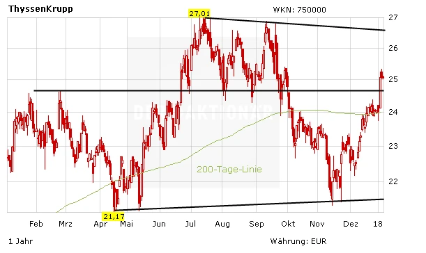 Die Aussichten auf steigende Stahlpreise haben mit für die gute Entwicklung der ThyssenKrupp-Aktie in den vergangenen Tagen gesorgt. Es bleibt aber dabei: Gelingt die Abspaltung des zyklischen Geschäfts, steht der DAX-Konzern vor der Neubewertung. Kurse über 30 Euro sollten dann möglich sein. Anleger setzen auf steigende Kurse, auch charttechnisch sieht es wieder deutlich freundlicher aus.