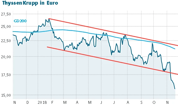 Der Umbau braucht Zeit und kostet Geld. Zudem geht die Führungsposse in eine neue Runde. Das Chaos bei ThyssenKrupp schreckt die Anleger ab und schickt die Aktie von einem Tief zum nächsten. Anleger sollten auf keinen Fall ins fallende Messer greifen und eine Beruhigung der Situation an der Seitenlinie abwarten.
