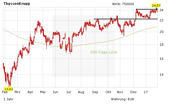 „In einer solchen Situation spricht jeder mit jedem. Unter anderem sprechen wir mit Tata Steel." Diese Worte verdeutlichen, dass Hiesinger die Stahlfusion weiter vorantreibt. Auch wenn es noch bis Mitte des Jahres dauern dürfte, sollte die Fantasie auf eine Konsolidierung den Kurs bald wieder auf ein neues Hoch treiben. Anleger bleiben an Bord und lassen die Gewinne laufen. Der Stoppkurs liegt bei 19,00 Euro.