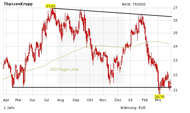 Die Stahlfusion muss und sollte zeitnah gelingen. Weitere Abspaltungen würden zeigen, dass die einzelnen Teile deutlich mehr wert sind als das Konglomerat selbst derzeit. Auch wenn eine komplette Zerschlagung unwahrscheinlich ist, steht die Aktie nach wie vor vor einer Neubewertung. Das schwache Chartbild und der volatile Gesamtmarkt belasten aber. Anleger sollten mit einem Neueinstieg deshalb vorerst noch abwarten.