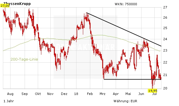 Bei ThyssenKrupp herrscht dicke Luft: Die Arbeitnehmer und der Aufsichtsratsvorsitzende Ulrich Lehner auf der einen Seite, die Finanzinvestoren Cevian und Elliot auf der anderen Seite und mittendrin Ursula Gather, deren Rolle nach wie vor schwer einzuschätzen ist. Es wartet in jedem Fall eine schwierige Aufgabe auf den neuen Konzernchef. Bei weiteren Abspaltungen wäre eine höhere Bewertung gerechtfertigt. Anleger benötigen Geduld und beachten den Stopp bei 18,00 Euro.