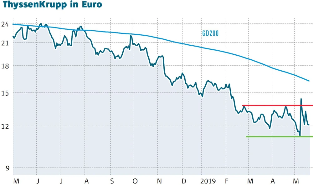 Die hohe Volatilität der ThyssenKrupp-Aktie zeigt, dass die Unsicherheit bei den Anlegern nach wie vor groß ist. Der Börsengang der Aufzugsparte sollte mittelfristig verborgene Werte heben. Steigende Kurse sind dann drin. Zunächst einmal ist aber auch ein erneuter Rücksetzer denkbar. Mutige spekulieren darauf mit einem Kauflimit bei 11,20 Euro.