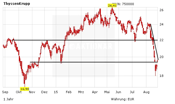 Die negative Stimmung am Gesamtmarkt hat die Aktie von ThyssenKrupp zuletzt besonders stark getroffen. In nicht einmal zwei Wochen hatte der DAX-Titel seit den Zahlen beinahe 25 Prozent verloren. Am Donnerstag kann der Stahl- und Industriekonzern allerdings deutlich zulegen und gehört zu den besten Werten im deutschen Leitindex.