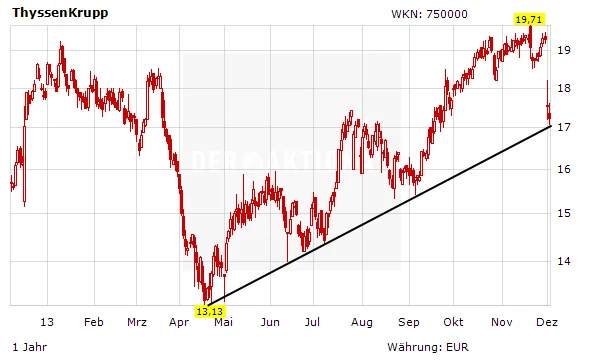 Spekulationen sind in den kommenden Tagen und Wochen damit Tür und Tor geöffnet: Erhöht Cevian weiter seinen Anteil? Wird ThyssenKrupp zum Übernahmeziel? Strebt Cevian eventuell eine Zerschlagung des Unternehmens an? All diese Überlegungen sollten eigentlich für steigende Kurse sprechen. Mutige Anleger spekulieren auf ein solches Szenario und setzen auf einen Rebound der Aktie.