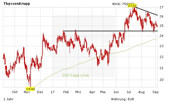 Nach wie vor muss Hiesinger zahlreiche Widerstände aus dem Weg räumen. Dies benötigt Zeit, sollte aber gelingen. Für Anleger bleibt eine Fusion mit Tata das beste Szenario. Kann sich ThyssenKrupp künftig auf die lukrativeren Technologiesparten – den Aufzugsbau, die Komponentenfertigung und die Industrial Solutions – fokussieren, steht die Aktie vor einer Neubewertung. Kurse über 30 Euro sind dann möglich.