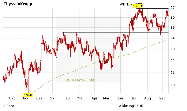 Am 24. September kommt der Aufsichtsrat zusammen. Dann könnte über die Tata-Fusion entschieden werden. Als Alternativen bleiben eine „Deutsche Stahl AG“ oder die radikale Zerschlagung des Konzerns. Egal, welche Lösung es wird: Die Werte der einzelnen Sparten von ThyssenKrupp dürften klarer zum Vorschein kommen. Die Aktie steht damit vor der Neubewertung. Kurse über 30 Euro sind weiter möglich.