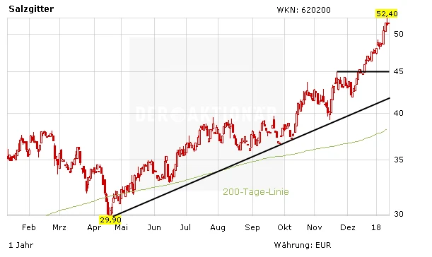 Bei ThyssenKrupp, Salzgitter, ArcelorMittal und Co sorgt die Untersuchung in den USA aber nicht mehr für Panik. Die anstehende Konsolidierung in der Branche durch die Fusion von ThyssenKrupp und Tata sowie der Rückgang der Billigimporte aus China sorgen vielmehr für Hoffnung, dass die Stahlpreise 2018 steigen werden. Die starke Performance der Aktien dürfte sich deshalb fortsetzen.