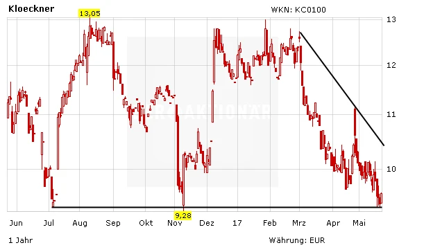 Beim Stahlhändler Klöckner & Co ist die Sache etwas anders. Ein Anstieg der Stahlpreise ist allerdings ebenfalls förderlich, da der Warenbestand an Wert gewinnt. Trotz der zuletzt angehobenen Prognose kommt die Aktie aber derzeit nicht vom Fleck. Solange das Chartbild derart angeschlagen bleibt – es droht sogar ein Fall nach unten aus dem langfristigen Seitwärtstrend –, sollten Anleger die Füße still halten.