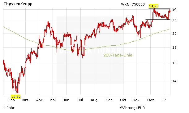 Die Papiere von ThyssenKrupp stehen zum Wochenende kurz vor dem Ausbruch über das 52-Wochen-Hoch bei 24,28 Euro. Impulse durch die Trump-Rede am Mittwoch gab es zwar nicht, dafür hat der DAX-Konzern mit einer Übernahme selbst für Schlagzeilen gesorgt. Die Baader Bank erachtet den Kauf des Sonartechnik-Spezialisten Atlas Elektronik als sinnvoll.