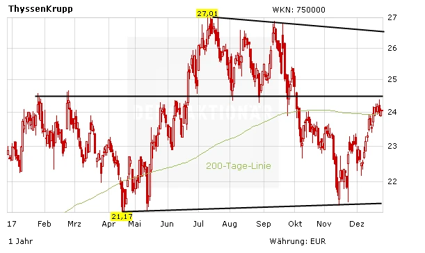 25 Analysten beschäftigen sich derzeit regelmäßig mit dem DAX-Titel. 15 davon empfehlen ThyssenKrupp zum Kaufe, lediglich drei Experten würden verkaufen. Hinzu kommen sieben Stimmen, die zum Halten der Aktie raten. Ebenfalls ein klares Zeichen: Das durchschnittliche Kursziel lautet 28,48 Euro und liegt damit etwa 18 Prozent über dem aktuellen Niveau.