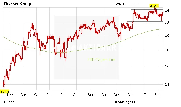 Die Überkapazitäten in der Stahlbranche dürften sich auch in den kommenden Jahren bemerkbar machen. Eine Fusion der europäischen Stahlaktivitäten mit dem indischen Wettbewerber Tata Steel wäre für ThyssenKrupp deshalb umso wichtiger. Mit einem Zusammenschluss könnte auch die angespannte Schuldensituation entlastet werden. Konzernchef Hiesinger ist mit dem Umbau auf dem richtigen Weg. Anleger setzen darauf, dass sich auch die Aktie weiter erholt und ein neues Hoch erreicht.