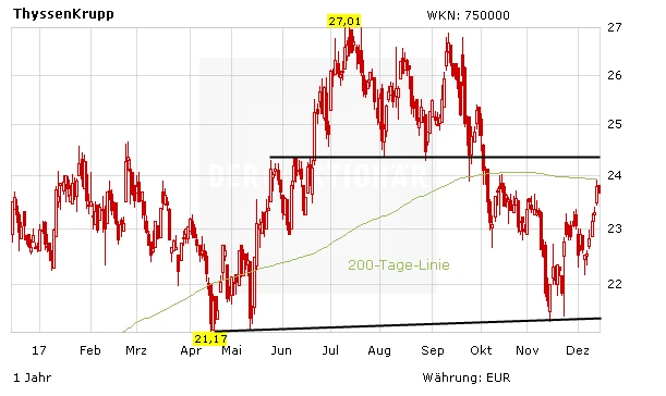 Die Gewerkschaften bleiben stur. Eine Einigung lässt nach wie vor auf sich warten. ThyssenKrupp muss nun zeigen, dass es gelingt, eine sinnvolle Lösung für die zyklische Stahlsparte zu finden. Ansonsten können auch die Technologiesparten nicht für die Zukunft gewappnet werden. Es droht dann eine Zerschlagung des Konzerns. Gelingt die Abspaltung allerdings, sind bei einer Neubewertung der Aktie deutlich höhere Kurse möglich. Anleger bleiben an Bord und beachten den Stopp bei 20,80 Euro.