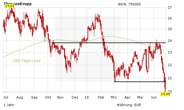 Die Aktie reagiert positiv auf die bevorstehende Abspaltung der Stahlsparte. Aus charttechnischer Sicht hat sich das Bild durch den Kursgewinn deutlich verbessert. Kurzfristig könnte es nun in den Bereich von 24 Euro gehen. Auf lange Sicht steht die Aktie vor einer Neubewertung. Der Stopp sollte bei 18 Euro platziert werden. DER AKTIONÄR spekuliert im Real-Depot mit einer Trading-Position auf steigende Kurse bei der DAX-Aktie.