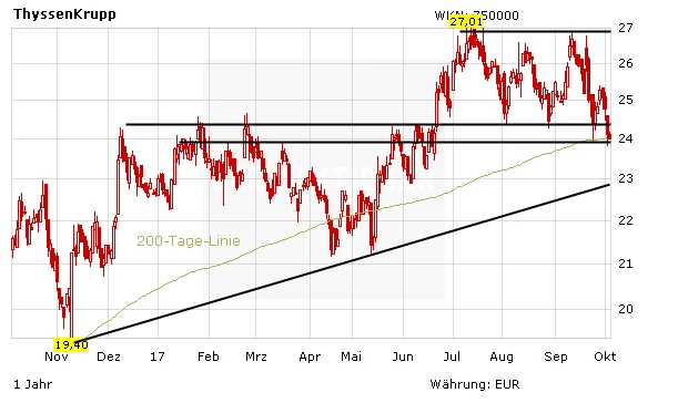 Trotz der anstehenden Stahlfusion mit Tata fehlen bei ThyssenKrupp nach wie vor die Impulse für den Ausbruch. Am Mittwoch fiel die Aktie des Technologiekonzerns zwischenzeitlich sogar unter die wichtige Unterstützung bei 24 Euro, konnte dann aber über dieser Marke schließen. Der Umbau des Unternehmens geht derweil weiter.