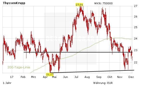Es ist positiv zu werten, dass die Großaktionäre den Druck erhöhen. Solange die Stahlfusion in der Schwebe ist, fehlen der Aktie die Impulse. Ohne die Stahlsparte steht der DAX-Titel allerdings vor der Neubewertung. Deutlich höhere Kurse sollten dann möglich sein. Langfristig bietet ThyssenKrupp nach wie vor ein äußerst attraktives Chance-Risiko-Verhältnis. Der Stopp liegt unverändert bei 20,80 Euro.