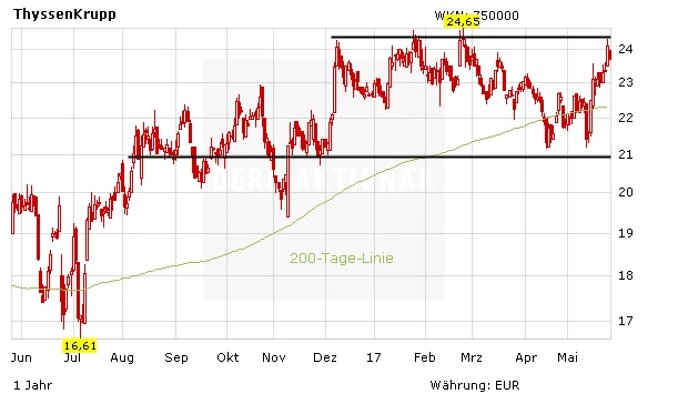 Es ist davon auszugehen, dass sich ThyssenKrupp in absehbarer Zeit von der Stahlsparte trennt. Hiesinger wird sich die Zeit nehmen, die er benötigt, und dann die sinnvollste Lösung wählen. Die Aktie steht dann vor einer Neubewertung. Ohne das Sorgenkind Stahl und mit einer verbesserten Bilanz wären sogar Kurse über 30 Euro drin. Anleger lassen die Gewinne laufen und bleiben an Bord.