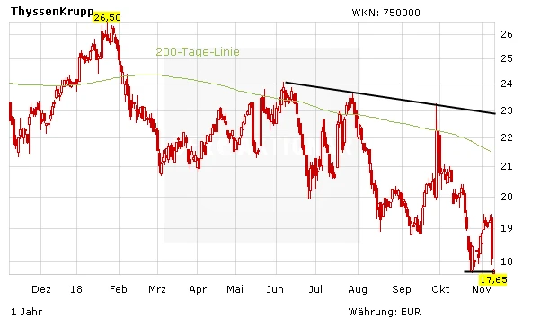 Für das laufende Geschäftsjahr 2017/18 rechnet ThyssenKrupp lediglich noch mit einem Überschuss von 100 Millionen Euro. Das Problem: Das Kartellverfahren wegen möglicher Absprachen bei Stahlpreisen entwickelt sich negativ, so dass nun Rückstellungen gebildet wurden. Hinzu kommen Risiken in der Komponentensparte und Probleme bei Stahl und Aufzügen. Die EBIT-Prognose wurde von 1,8 auf 1,6 Milliarden Euro zurückgenommen.