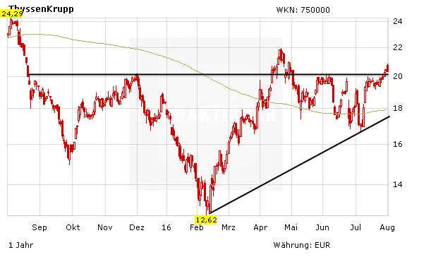 Seit dem Tief Anfang des Monats hat die Aktie von ThyssenKrupp wieder 25 Prozent an Wert gewonnen. Trotz der Branchenkrise darf der Blick der Anleger nach oben gehen. Neue Impulse könnten die Zahlen geben, die am 11. August veröffentlicht werden. Der Chef des weltgrößten Stahlherstellers ArcelorMittal bleibt jedenfalls optimistisch.