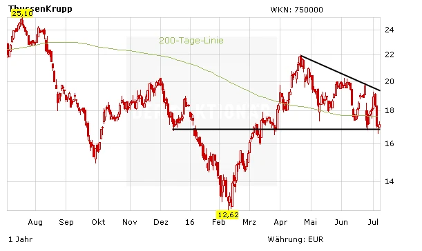 Eine klare Erholung bei ThyssenKrupp steht nach wie vor aus. Die Aktie bewegt sich weiterhin zwischen 17 und 19 Euro. Die Fusion mit Tata wäre ein wichtiger Schritt, um sich in Zukunft vermehrt auf die Technologiesparte konzentrieren zu können. Anleger hoffen auf neue Impulse und bleiben vorerst an Bord.