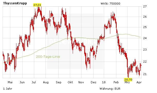 Die Aktie von ThyssenKrupp hat im Bereich zwischen 21 und 22 Euro einen Boden ausgebildet. Langfristig stimmen die Aussichten bei einer Abspaltung der Stahlsparte nach wie vor. Eine Neubewertung wäre notwendig. Der Sprung über den Widerstand im Bereich von 22,20 Euro würde ein neues Kaufsignal bedeuten.