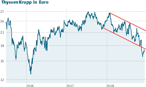 Nach wie vor kann sich die Aktie von ThyssenKrupp nicht nachhaltig vom Jahrestief bei 15,52 Euro lösen. Schwache Zahlen inklusive erneuter Gewinnwarnung belasten, doch auch die offenen Fragen beim Umbau verunsichern die Anleger. Selbst beim lange beschlossenen Joint Venture mit Tata Steel herrscht nach wie vor viel Unsicherheit.