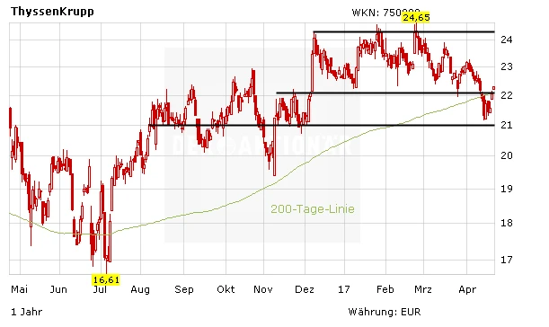 Die Kritik der Arbeitnehmer setzt sich erwartungsgemäß fort. Ohne Restrukturierung dürfte der Stahlbereich allerdings keine Zukunft haben. Die Sparte kann bislang nicht einmal nachhaltig die Kapitalkosten erwirtschaften. Eine Fusion mit Tata würde Sinn machen und auch der Aktie neuen Schwung verleihen. Wer investiert ist, setzt auf dieses Szenario. Der Stopp liegt bei 19,50 Euro.