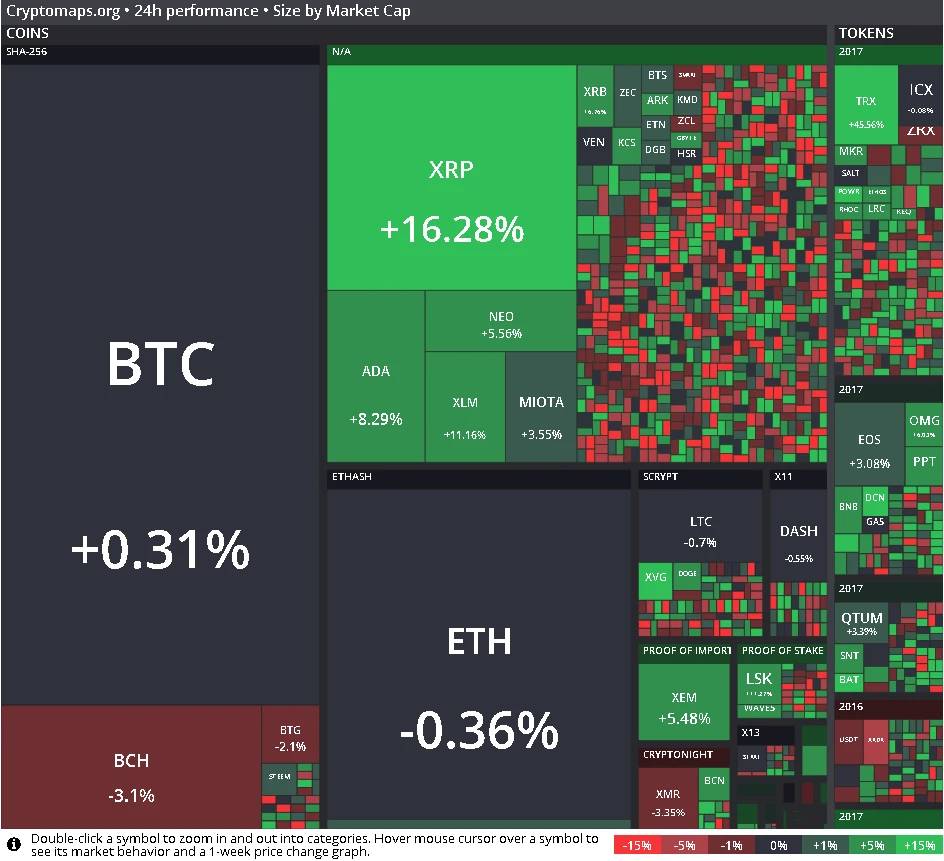 Auf der Grafik von cryptomaps.org sind die Entwicklungen der letzten 24 Stunden farbig dargestellt. Die Blöcke sind außerdem proportional zur Marktkapitalisierung der jeweiligen Währung.
