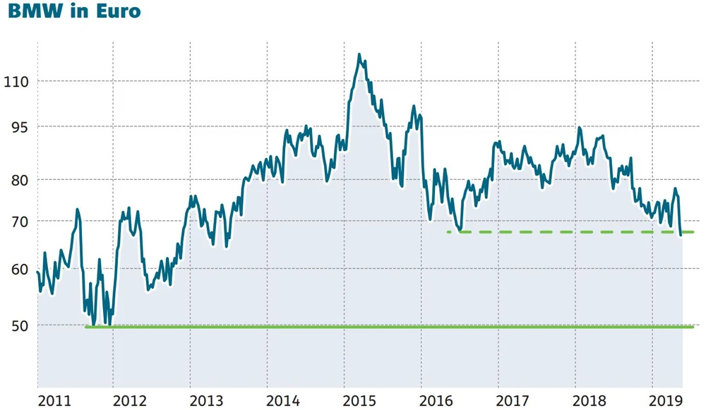 Die BMW-Aktie notiert zur Stunde unter 67 Euro und damit auf dem tiefsten Stand seit Juli 2016. Sollte sich der Kurs nicht schnell fangen, wartet ein Abstieg bis zur massiven Unterstützung bei 63,38 Euro. Sollte BMW auch dort keinen Halt finden, gibt es bis 50 Euro keine nennenswerten Unterstützungen mehr.