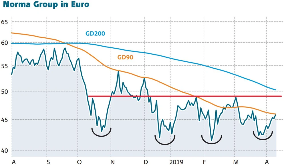 Die Vorzüge von Volkswagen beispielsweise notieren seit Jahresbeginn rund acht Prozent im Plus. Das ist noch deutlich weniger als beim DAX, doch der Trend zeigt nach oben. Das tut er auch beim Spezialisten für Verbindungstechnik, der Norma Group. Der Automobilzulieferer, der in den letzten Monaten einen sogenannten Vierfachboden ausgebildet hat, ist dabei die 90-Tage-Linie zu überwinden und den oberen Rand der monatelangen Seitwärtsrange bei 49 Euro anzulaufen. Sollte auch noch der GD200 übertrumpft werden, ist mit einem Anstieg in Richtung 55/56 Euro zu rechnen.