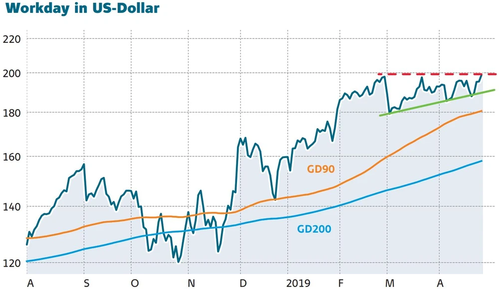 Die Cloud-Branche boomt und damit die Aktien der großen Cloud-Software-Anbieter. SAP ist nach den jüngsten Quartalszahlen auf ein neues Rekordhoch gestiegen, ServiceNow hat es gestern nachgemacht. Workday ist noch an der Reihe mit Q1-Zahlen, doch verheißt der Chart bereits sehr viel Gutes. Ein Faktor-Zertifikat ist für den AKTIONÄR die richtige Wahl.