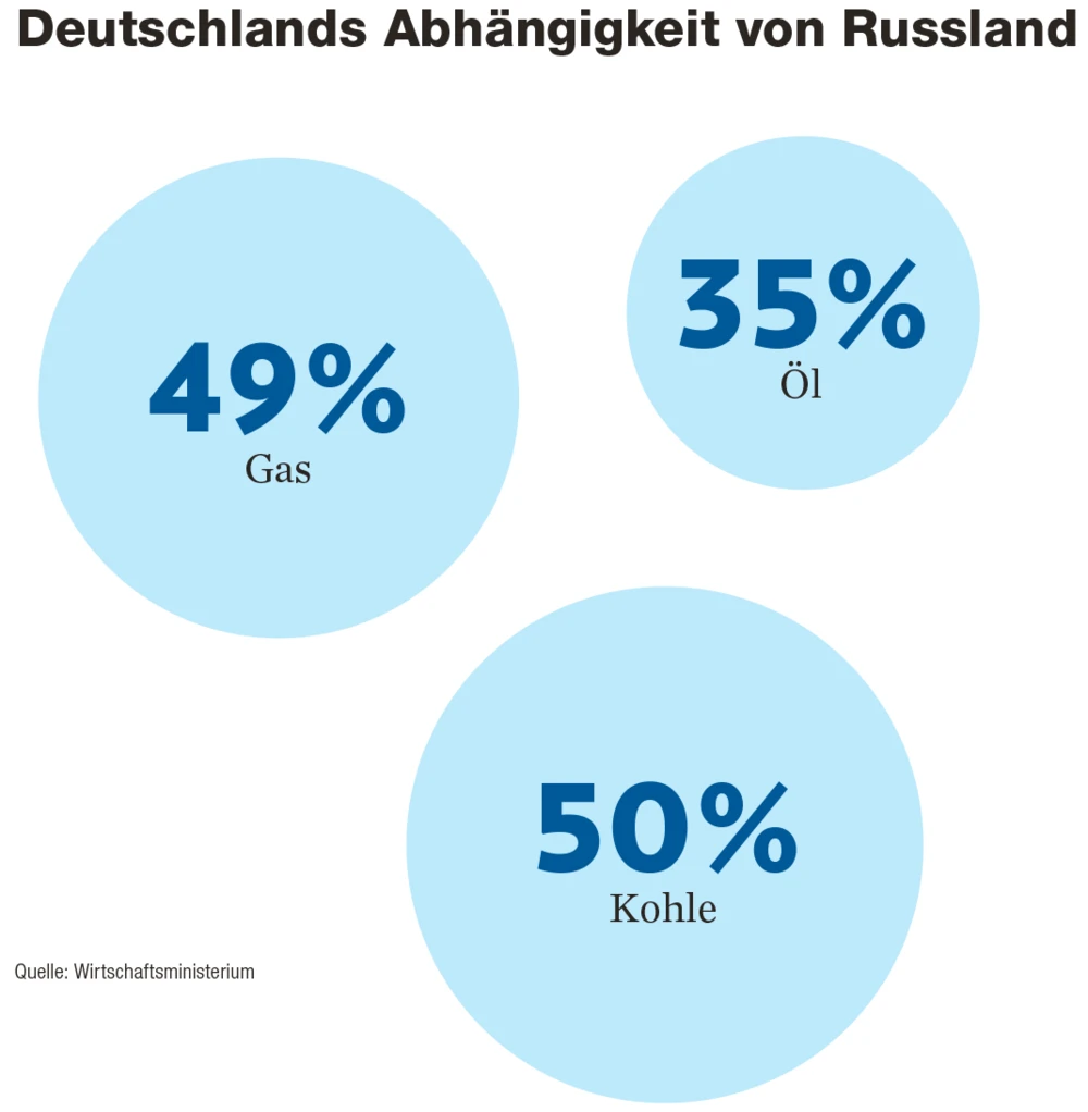 In dieser Woche etwa hat Verteidigungsministerin Christine Lambrecht die Anschaffung von bis zu 35 US-Tarnkappenjets vom Typ „F35“ angekündigt. Der Stückpreis: geschätzte 70 Millionen Euro. Neben der weiteren Aufrüstung bemüht sich die Politik, so schnell wie möglich die Abhängigkeit von Russland als Rohstofflieferant zu verringern. „Wenn es gelingt, sind wir im Herbst unabhängig von russischer Kohle und Ende des Jahres von russischem Öl“, äußerte sich Wirtschaftsminister Robert Habeck in einem Interview mit der FAZ vorsichtig optimistisch. Was das Thema Erdgas betrifft, warnt Habeck jedoch vor überzogenen Erwartungen. Deutschlands Abhängigkeit in diesem Bereich ist hoch (siehe Grafik) und die Möglichkeiten zur Substituierung begrenzt. Zwar will Berlin schnellstmöglich mit neuen Lieferanten verhandeln, auch sollen an zwei deutschen Standorten Terminals für Flüssiggastanker (LNG) gebaut werden. Doch das alles kostet Zeit.