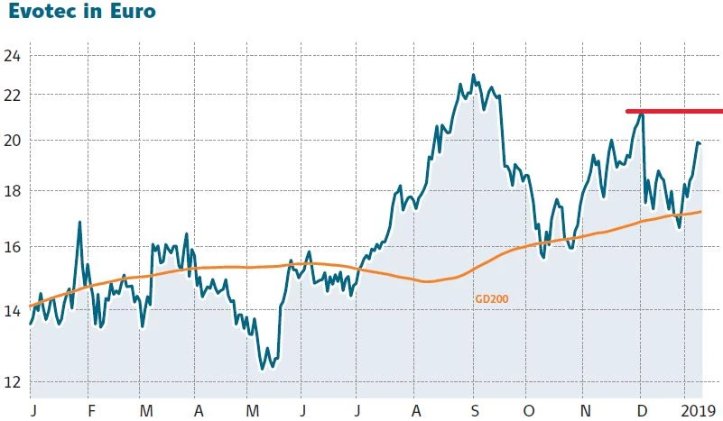 Ganz klar weiter auf der Empfehlungsliste des AKTIONÄR steht auch die Aktie von Evotec. Die Präsentation vom Vorstandsvorsitzenden Werner Lanthaler auf der viel beachteten J.P. Morgan Healthcare Conference in San Francisco am gestrigen Donnerstag ist gut angekommen. Die Aktie hat die psychologisch wichtige Marke von 20 Euro zurückerobert. Bei Evotec wartet die nächste Hürde nun beim Dezemberhoch 2018 bei 21,82 Euro.