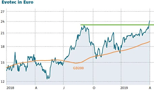 Die Aktie von Evotec ist bereits am vergangenen Freitag nach Vorlage der Zahlen für das vergangenen Geschäftsjahr der Ausbruch auf ein neues Mehrjahreshoch gelungen und damit ein starkes Kaufsignal. Auf die heutige Meldung reagiert die Aktie erneut mit einem deutlichen Plus von 2,3 Prozent auf 24,23 Euro. Damit wurde der charttechnische Ausbruch eindrucksvoll bestätigt. Seit der Empfehlung des AKTIONÄR im Oktober vergangenen Jahres konnte die Aktie bereits 40 Prozent zulegen. Anleger lassen ihre Gewinne laufen, ziehen den Stopp zur Absicherung aber etwas nach auf 17,50 Euro.