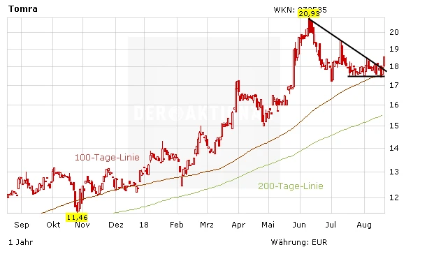 Die Einführung eines breiten Pfandrücknahmesystems in Großbritannien nimmt Formen an. Tomra Systems sollte von einer zeitnahen Umsetzung profitieren. Diese Einschätzung teilt auch der Markt: Zu Wochenbeginn verbucht die Tomra-Aktie Zugewinne und kann den seit Juni bestehenden Abwärstrend überwinden. Gelingt es dem Papier auch das Juli-Verlaufshoch zu knacken, sollte das Mehrjahreshoch bei 20,93 Euro erneut angesteuert werden. Langfristig bleibt der Nischen-Player ein Top-Investment.