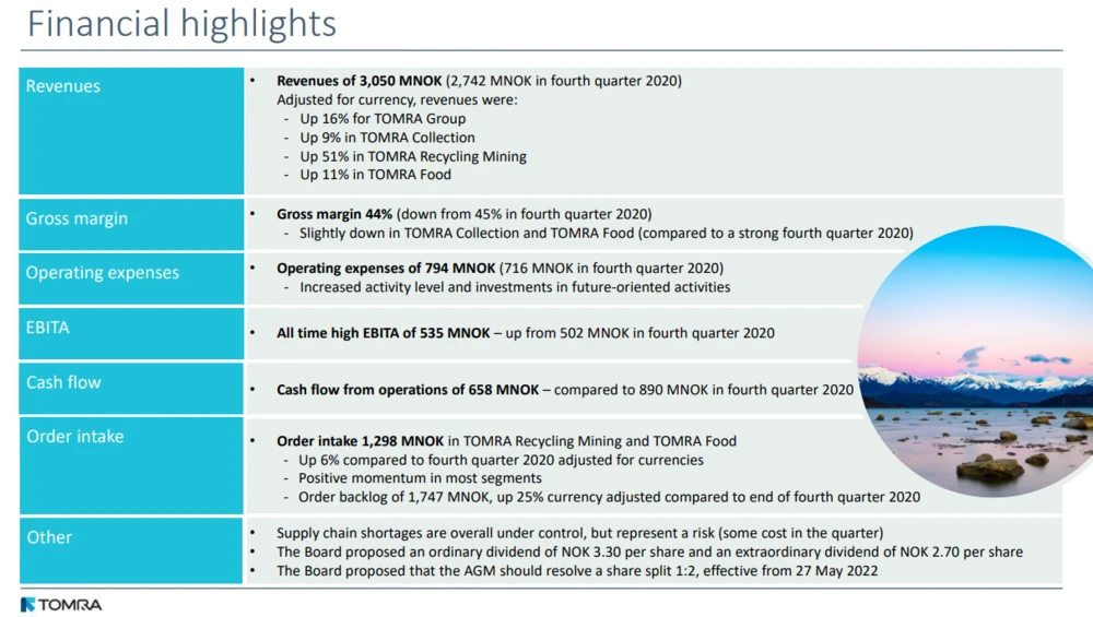 Das norwegische Unternehmen hat seine Zahlen zum vierten Quartal veröffentlicht. Sowohl beim Umsatz, EBITA als auch dem Ergebnis je Aktie verzeichnete Tomra Systems im Berichtszeitraum neue Rekordwerte. Ebenfalls positiv hervorzuheben: Die Skandinavier haben die zuletzt viel zitierten Lieferketten im Griff.