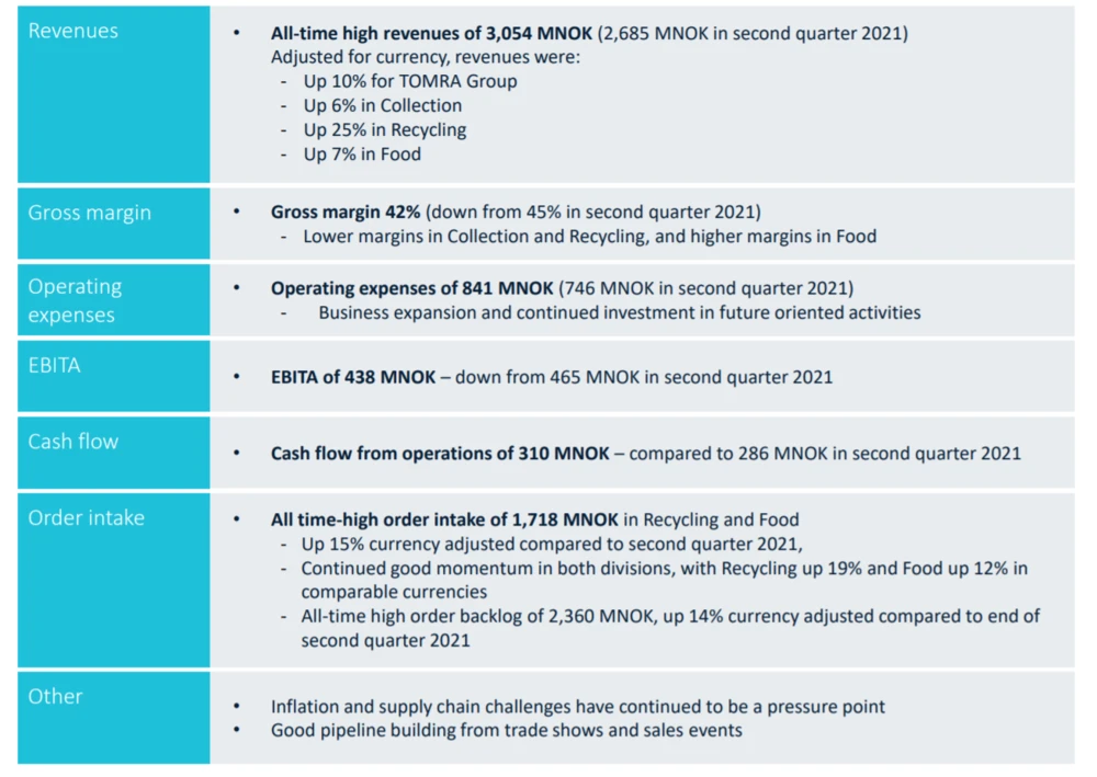 Der Recycling-Spezialist Tomra Systems hat seine Zahlen für das zweite Quartal vorgelegt. Und die sind solide ausgefallen: Sowohl der Umsatz als auch der Auftragseingang befinden sich auf Rekordniveau. Dennoch haben auch die Norweger derzeit mit Gegenwind aufgrund der zahlreichen globalen Probleme zu kämpfen.