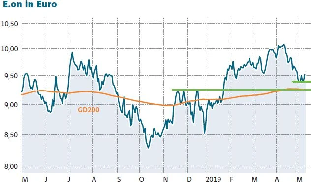 Die Aktie von E.on startet mit einem leichten Minus in die neue Handelswoche. Langfristig bleiben die Aussichten dank des künftigen Fokus auf Netze und Kundendienstleistungen aber gut. DER AKTIONÄR empfiehlt Anlegern, weiter mit einem Stopp bei 7,80 Euro investiert zu bleiben. Unterstützung erhält das Papier vom Maitief bei 9,30 Euro sowie der knapp darunter verlaufenden 200-Tage-Linie.