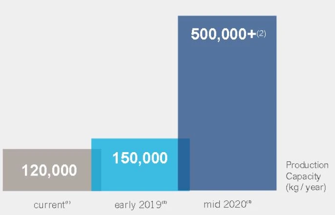 Entwicklung der weltweiten Produktionskapazität von Aurora Cannabis, Quelle: Aurora