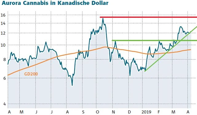 Die Aktie von Aurora Cannabis hat Anfang März ein großes Kaufsignal generieren können. Zuletzt war das Papier nach dem starken Anstieg in einen leichten Konsolidierungsprozess übergegangen. Dieser scheint nun aber bereits wieder abgeschlossen zu sein. Das Papier gewann am Freitag 2,8 Prozent auf 12,28 Kanadische Dollar. Kann das Märzhoch bei 13,67 Kanadische Dollar überwunden werden, wartet auf dem Weg nach oben nur noch das Allzeithoch vom Oktober 2018 bei 16,24 Kanadische Dollar.