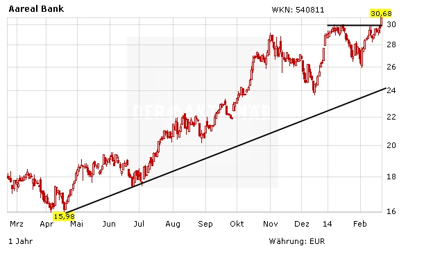 Kepler-Analyst Dirk Becker zeigte sich nach den Zahlen sowohl vom Gewinn als auch vom Dividendenvorschlag der Aareal Bank positiv überrascht Am Donnerstag hatte die Vorstandschaft mit starken Zahlen und einem positiven Ausblick überzeugt. Am heutigen Freitag haben die Papiere mit einem Plus von knapp drei Prozent jetzt bereits ein neues Jahreshoch aufgestellt. Gelingt auch der nachhaltige Ausbruch über die 30-Euro-Marke, sind weitere Höchststände eine Frage der Zeit.