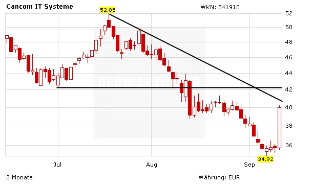 Die positiven Signale aus der Konzernzentrale in München bescheren der Cancom-Aktie einen zweistelligen Kursgewinn und erste charttechnische Impulse. Im Bereich von 41 Euro verläuft die Oberseite des seit Mitte Juli ausgebildeten Abwärstrends, knapp oberhalb der Marke von 42 Euro lauert der nächste horizontale Widerstand. Gelingt es dem TecDAX-Titel auch diese charttechnischen Hürden zu überwinden, sollte die Aktie weiteres Aufwärtspotenzial freisetzen. Für Trader bietet das Papier somit auf kurz- bis mittelfristige Sicht attraktive Chancen.