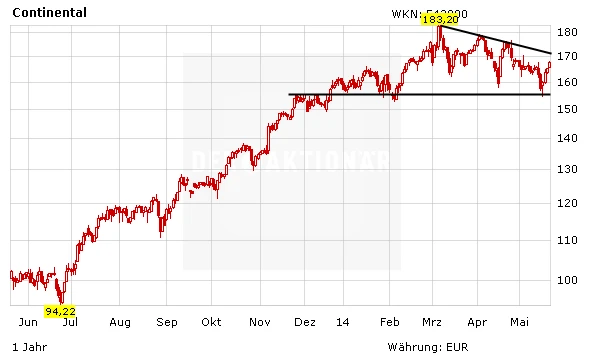 Sollte der Sprung über die 170-Euro-Marke nachhaltig gelingen, würde die Aktie dementsprechend ein neues charttechnisches Kaufsignal generieren. Die Analysten sind ebenfalls weiterhin optimistisch gestimmt. Ihr durchschnittliches Kursziel liegt bei 187,39 Euro und damit deutlich über dem aktuellen Niveau. Mit einem 2014er-KGV von 13 ist Continental zudem noch nicht zu teuer bewertet.