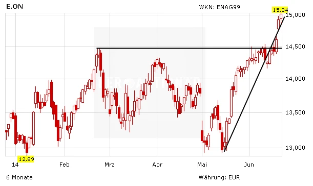 Mit dem Sprung über das Zwischenhoch vom April vergangen Jahres ist es der E.on-Aktie nun der Ausbruch aus ihrem zweieinhalbjährigen Seitwärtstrend gelungen. Zuletzt mehrten sich positive Analysteneinschätzungen. Jüngst hatte sich Bernstein Analyst Deepa Venkateswaren positiv zu RWE geäußert. Der Experte hat die Einstufung für E.on auf „Outperform“ mit einem Kursziel von 16 Euro belassen. Nach einigen schwierigen Jahren im Geschäft mit konventioneller Stromerzeugung seien die Perspektiven für den deutschen Versorgersektor wieder gut, so der Analyst. Die Strompreise dürften sich stabilisieren und die Investitionen in die Stromnetze sollten sich auszahlen.