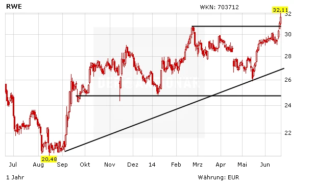 DER AKTIONÄR ist teilt die Zuversicht bei den Versorgeraktien. Allerdings wird im Vergleich RWE, insbesondere mit Blick auf die Energiewende, bevorzugt. Auch aus charttechnischer Sicht wird es bei RWE interessant. Mit dem Ausbruch auf ein neues Jahreshoch ist der Weg nun nach oben frei. Auch E.on konnte auf ein neues Hoch klettern. Kurzfristig bietet die Aktie durchaus weiters Aufwärtspotenzial.