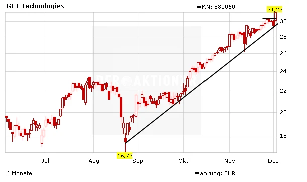 Damit nehmen die Aktien des auf die Finanzbranche spezialisierten IT-Dienstleisters Anlauf auf das nächste Hoch, das aus dem Jahr 2001 stammt. Diese Entwicklung ist auch völlig nachvollziehbar, denn erst Mitte November hatte eine erneute Anhebung der Unternehmensprognosen für 2015 den Papieren frischen Schwung verliehen. GFT profitiert unter anderem von der zunehmenden Regulierung der Finanzbranche.