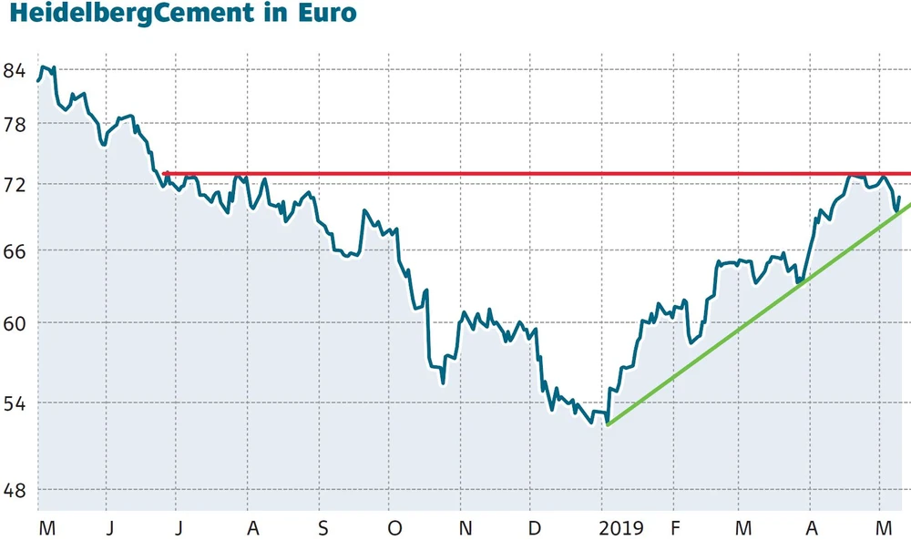 Mit einem Plus von rund 30 Prozent ist HeidelbergCement 2019 bislang nach Adidas der zweitstärkste Wert im DAX. Starke Zahlen zum ersten Quartal haben den Kursanstieg nun untermauert. Am Donnerstag führt der Baustoffkonzern den deutschen Leitindex im schwachen Marktumfeld deshalb erneut an – und es ist noch Luft nach oben.
