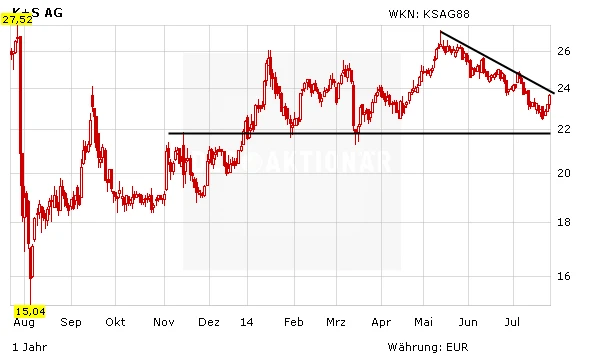 Mitte August wird auch K+S seinen Quartalsbericht vorlegen. Sollten die starken Daten der Konkurrenz bestätigt werden können, ist ein Sprung bis zur 26-Euro-Marke möglich. Dort wartet die obere Barriere des langfristigen Seitwärtstrends. Die Preise am Kalimarkt erholen sich nur langsam, dennoch hat sich die Lage zuletzt etwas entspannt. Investierte Anleger setzen auf steigende Kurse und bleiben an Bord.