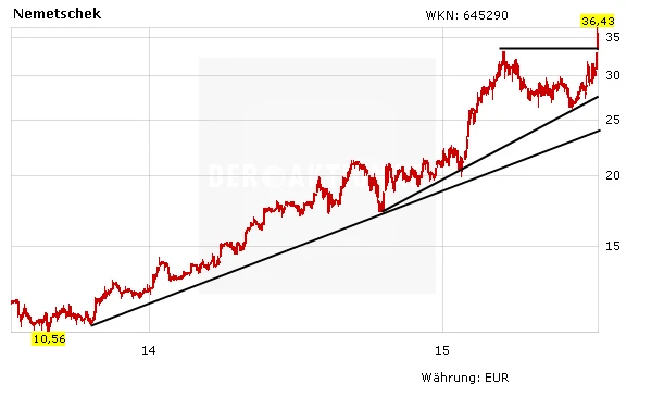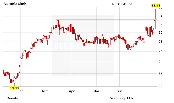 Noch am Freitag hatte Lars Dannenberg von der Privatbank Hauck & Aufhäuser Nemetschek nach einer Investorenkonferenz von "Hold" auf "Buy" hochgestuft und das Kursziel von 30 auf 35 Euro angehoben. Mit dem heutigen Kurssprung ist dieses Kursziel allerdings schon übertroffen worden.