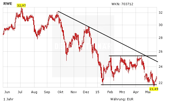 Charttechnisch hat sich das Bild bei der RWE-Aktie mit dem neuen Jahrestief weiter eingetrübt. Noch hält der Bereich zwischen 21,50 und 21,70 Euro zwar als Unterstützung und untere Begrenzung des Seitwärtstrends, doch ein erneuter Test dürfte nur eine Frage der Zeit sein. Der Abwärtstrend ist zudem weiterhin aktiv. Erfreulicher wird das Bild erst bei einem Sprung über die obere Begrenzung des Korridors bei 25,50 Euro.
